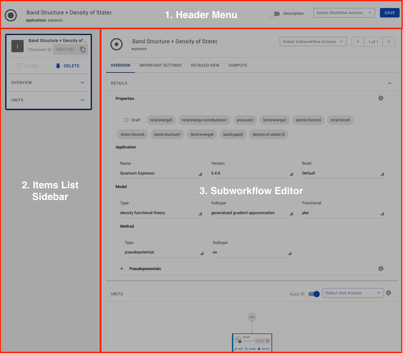 Our platform provides a convenient interface for conceiving, editing and saving workflows which implement different types of studies of materials. We refer to this interface as the Workflow Designer, and we reviewed it in detail in this section of documentation.